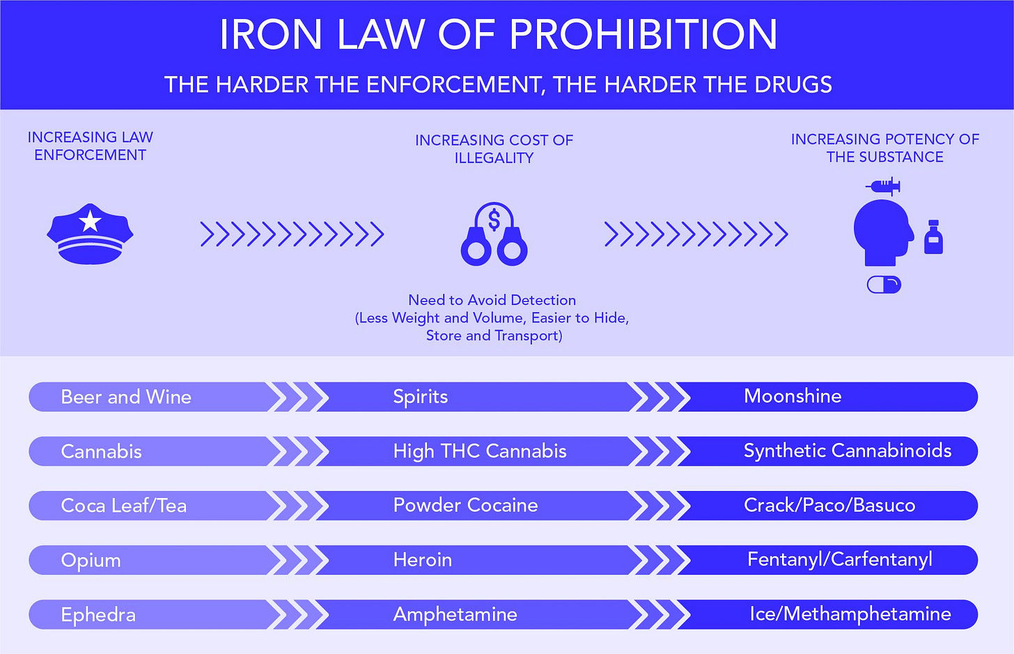 Blame it on the “Iron Law of Prohibition.” First put forth by Richard Cowan in 1986, the Iron Law of Prohibition states: “As law enforcement becomes more intense, the potency of prohibited substances increases.”
